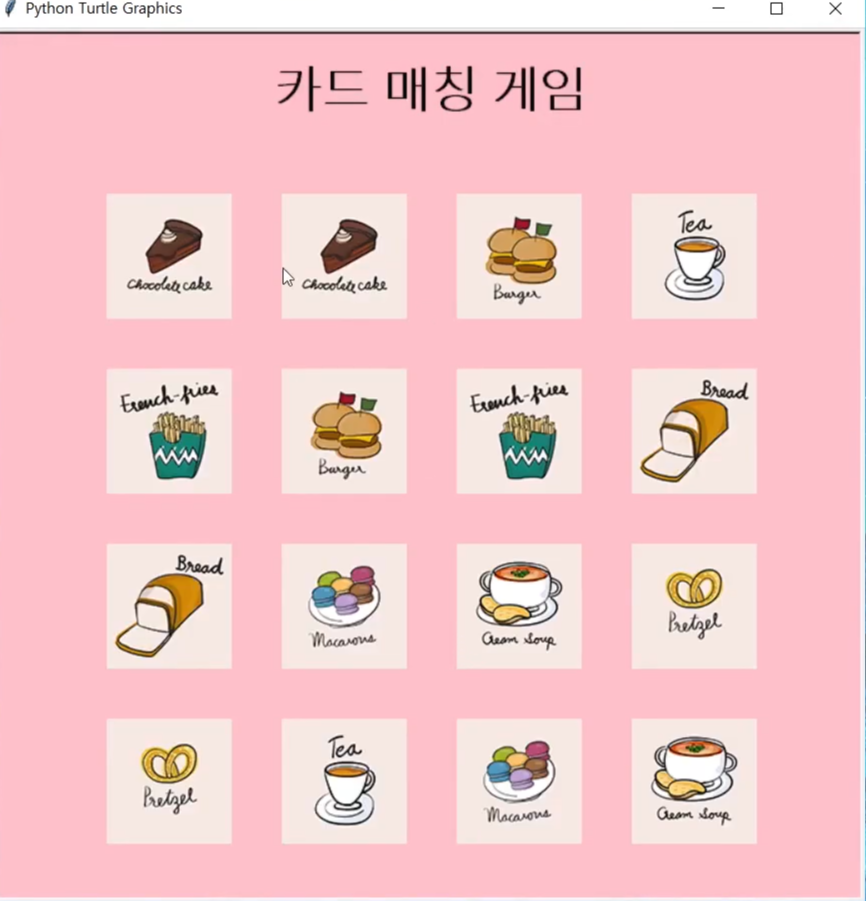이번 파이썬 기초 강좌에서는 카드 짝을 맞추는 게임을 만들어 보겠습니다~