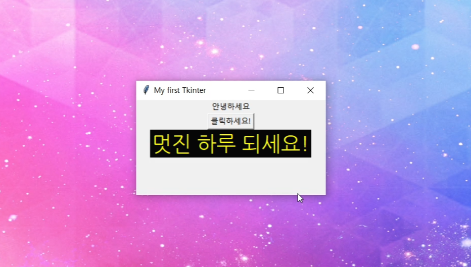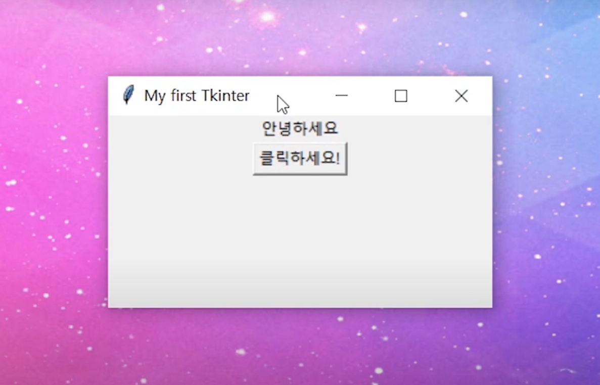 오늘은 Tkinter의 첫 시간으로 간단하게 글자를 적고, 버튼을 생성하는 방법에 대해 알아볼 거랍니다.
