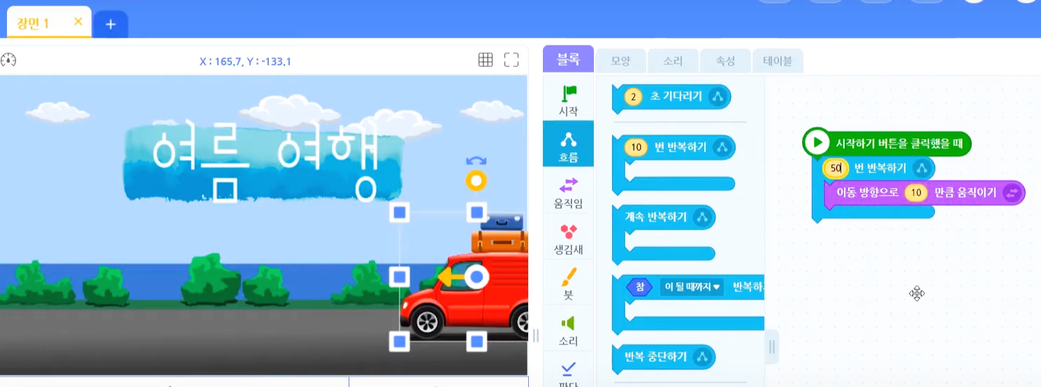 저희는 천천히 달려 나가는 효과를 적용시켜 주기 위해, ~번 반복하기라는 반복문을 사용해 볼 거랍니다.