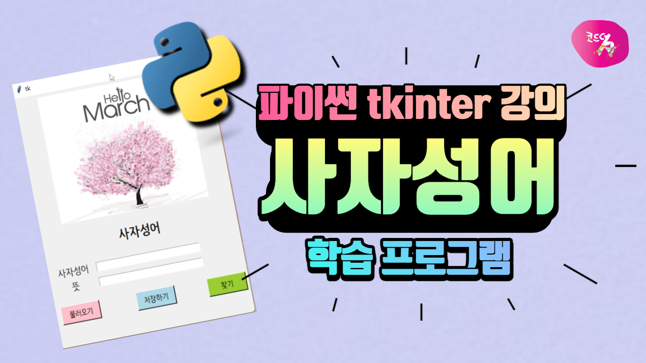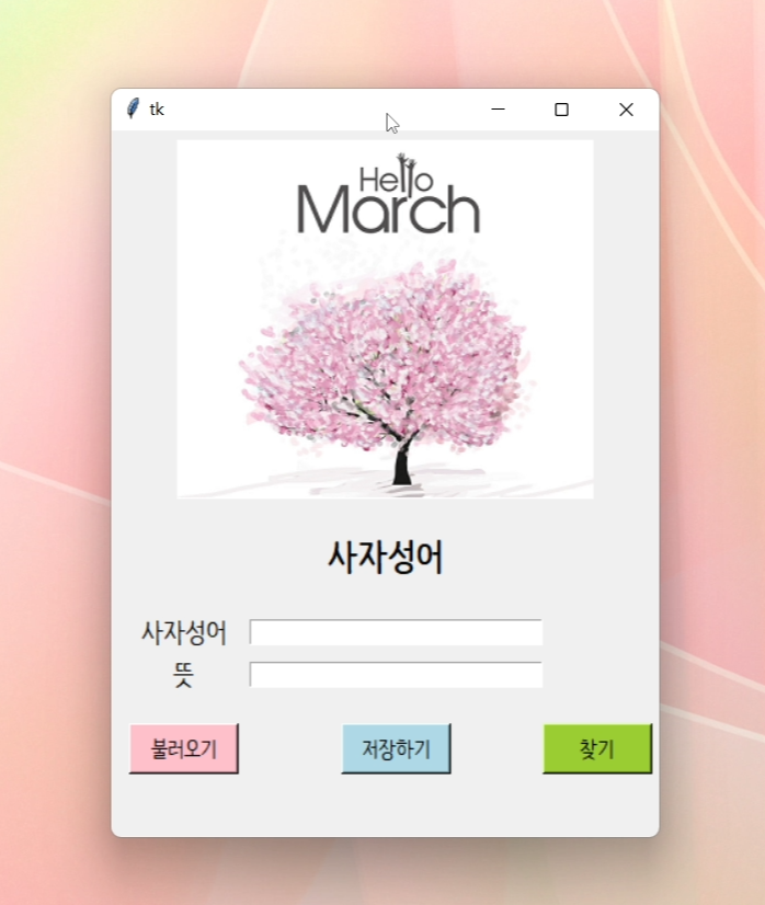 오늘 파이썬 tkinter로 만들어 볼 프로그램은 사자성어나 영어단어 등을 저장해 두고 관리할 수 있는 단어장 프로그램입니다.