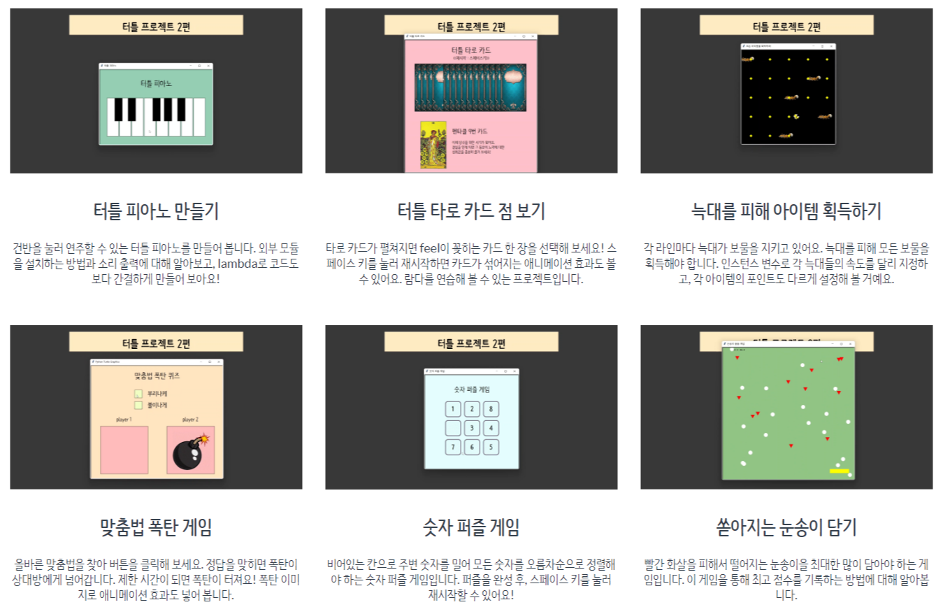 파이썬의 기초 개념들을 배워나가는 과정에서도 다양한 프로젝트를 체험해 볼 수 있도록
