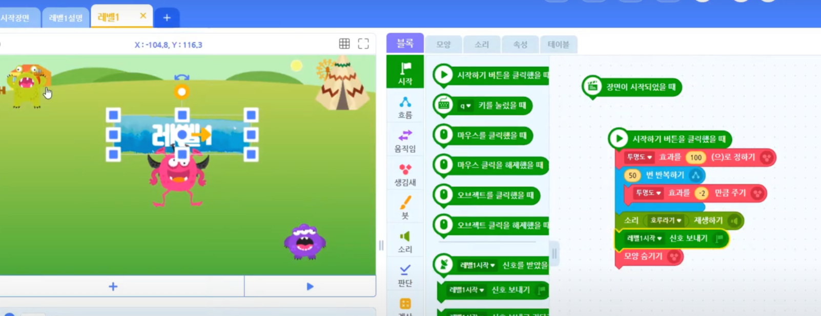 레벨 1 이라는 이 글자는 "레벨 1 시작"이라는 신호가 들어올 때 사라지도록 코딩을 해줄 거예요.