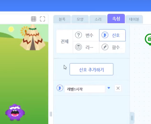 먼저 이렇게 [속성] 탭에 가서 [레벨1]이라는 신호를 만들어줍니다.