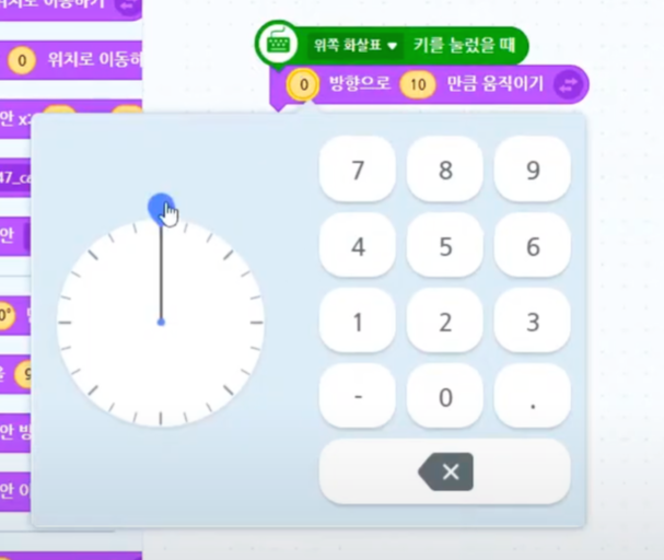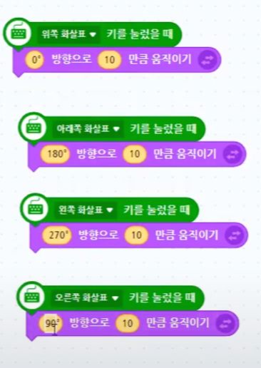 그래서 "방향"과 "이동" 이 두가지를 한꺼번에 바꿔줄 수 있는 아래 블록을 쓸 거랍니다.
