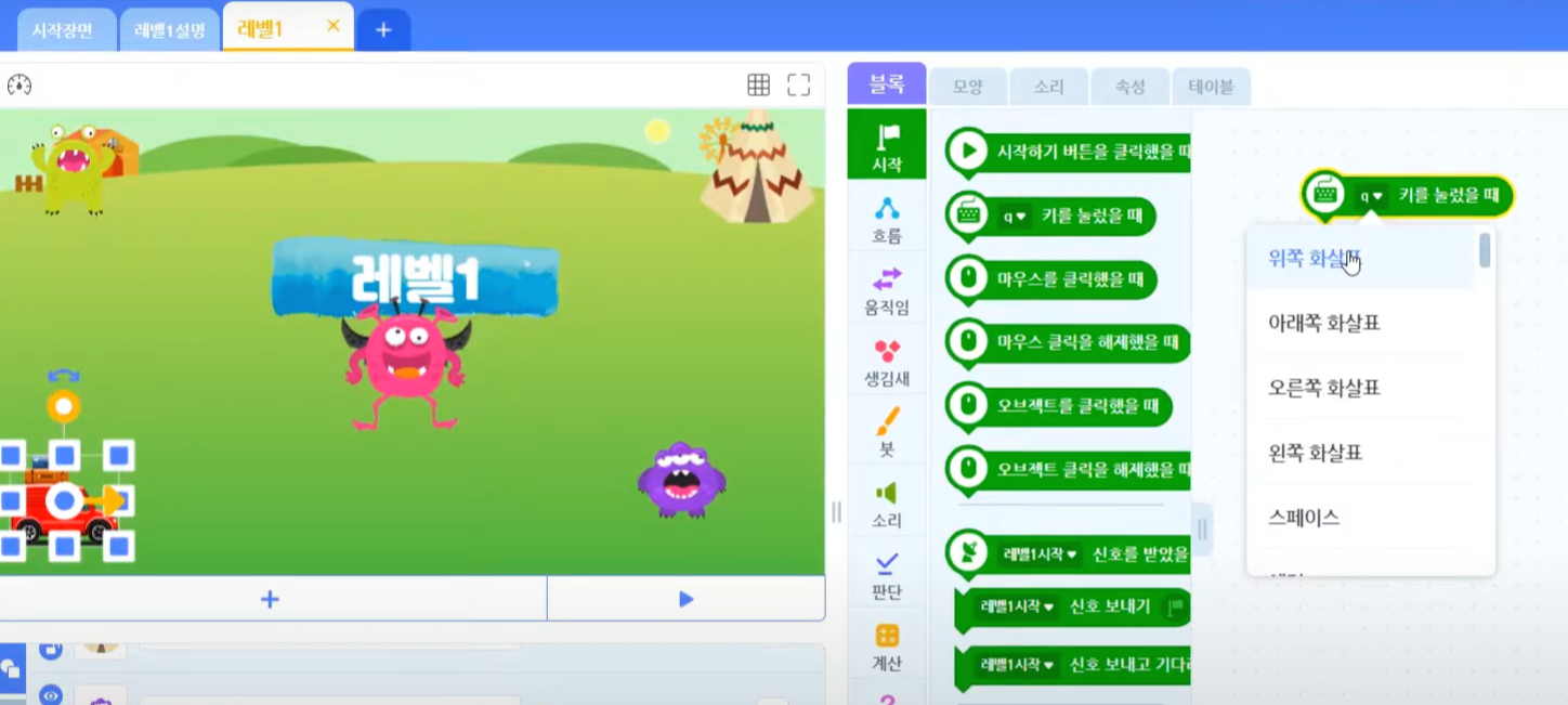 오늘 사용할 블록은 [시작] 카테고리 안에 [~키를 눌렀을 때] 라는 블록을 사용할 거랍니다.