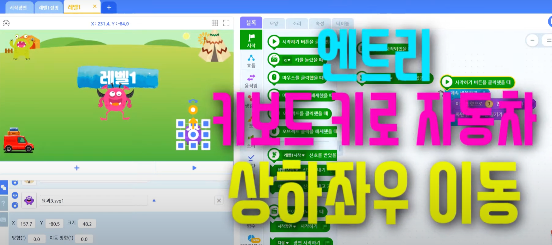 | [엔트리 게임 코딩] 10. 자동차를 따라다니는 요괴 만들기 | ~초 동안 ~로 이동하기 | 엔트리 기초 코딩 강좌 (0) | 2020.11.03 |