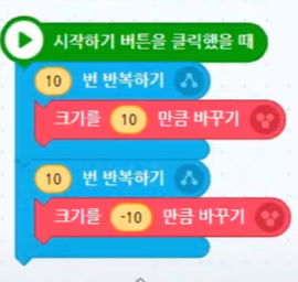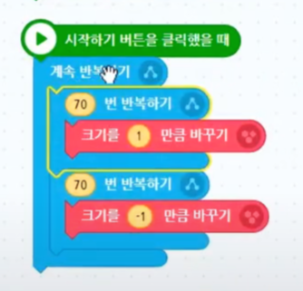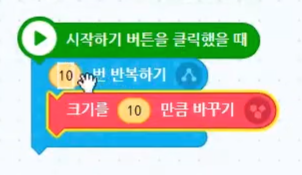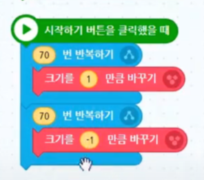 조금씩 커지는 효과를 만들어주기 위해, [~번 반복하기] 블록을 함께 사용해 줄 거랍니다.