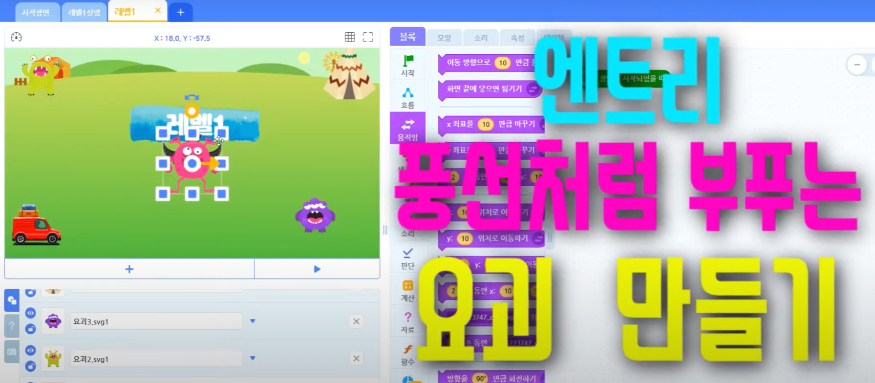 | [엔트리 게임 코딩] 10. 자동차를 따라다니는 요괴 만들기 | ~초 동안 ~로 이동하기 | 엔트리 기초 코딩 강좌 (0) | 2020.11.03 |