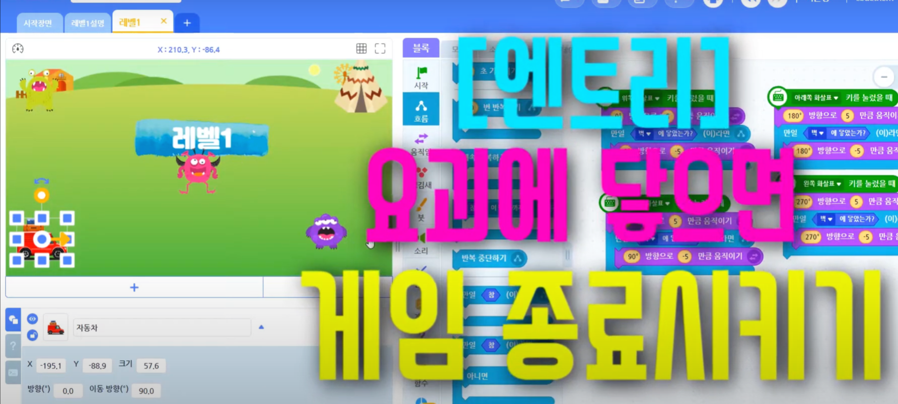 이번에는 자동차가 목적지에 도착하기 전에 요괴에 닿으면 게임이 종료되도록 코딩을 해 줄 거랍니다.