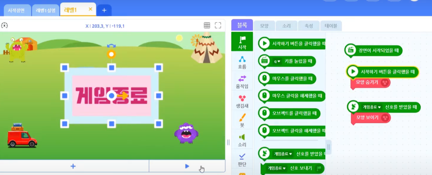이제 게임 종료 오브젝트 코딩으로 넘어가 볼까요?