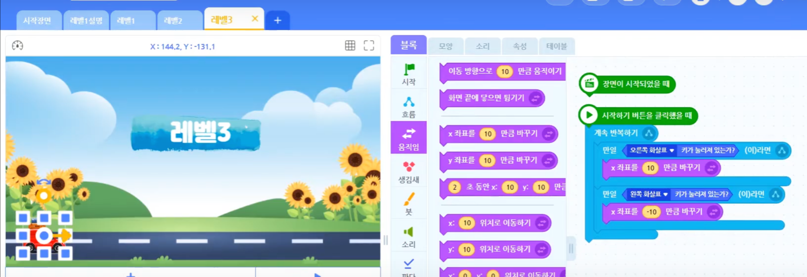 | [엔트리 게임 코딩] 16. 카 레이스 게임 만들기 2편 | 목적지에 도착하면, 레벨 3으로 장면 전환하기 (0) | 2020.11.07 |