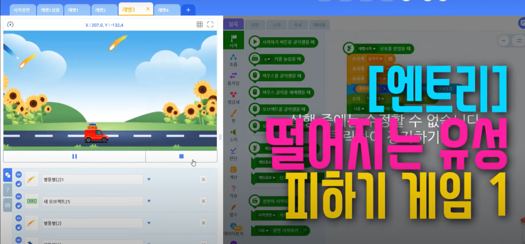 지난 시간에 엔트리 게임 만들기 레벨 2까지 마무리했죠~