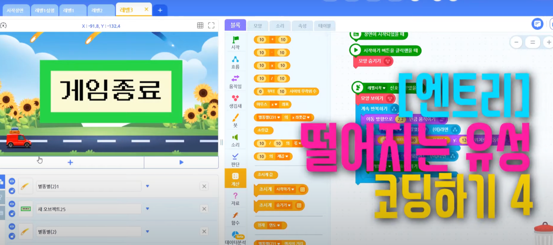 지난 시간에 이어, 엔트리 게임, 레벨 3 떨어지는 별똥별을 피해라!라는 게임을 만들고 있는데요~