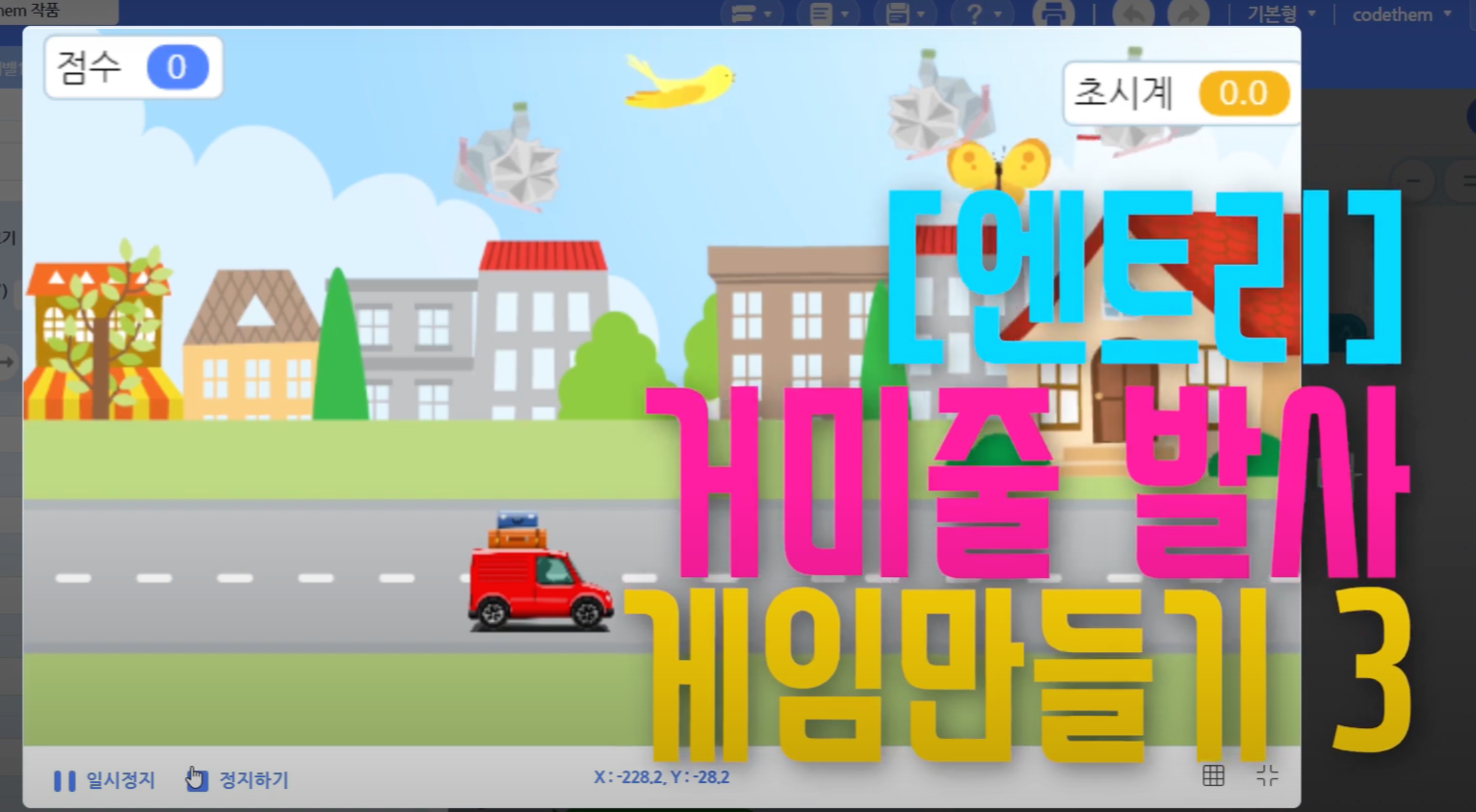 | [엔트리 게임 코딩] 22. 스페이스 키를 눌러 거미줄 쏘아 올리기 | 물체를 발사하는 방법 | 자동차 위치를 항상 따라다니도록 코딩하기 (0) | 2020.11.12 |