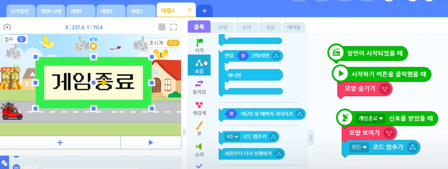 그리고 마지막으로 게임 종료 오브젝트 코딩을 해줍니다.
