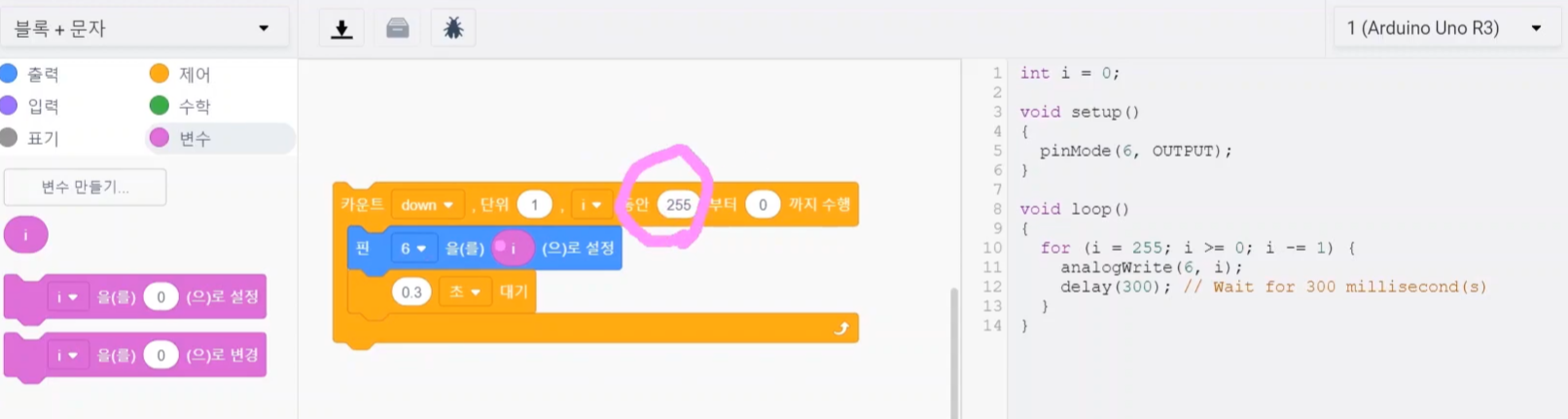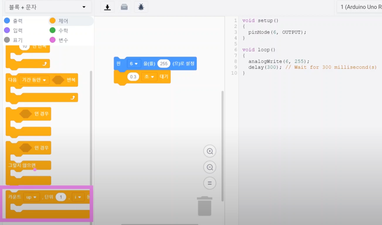 이 블록을 6번 핀의 출력값으로 설정을 해 줄 거랍니다.