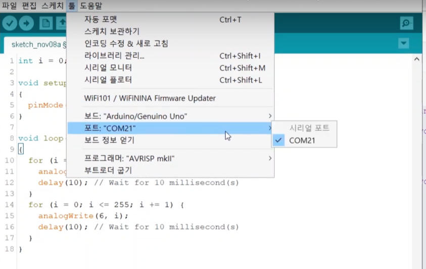 아두이노와 연결했을 때 자동으로 추가되는 포트를 선택해 주시면 된답니다.
