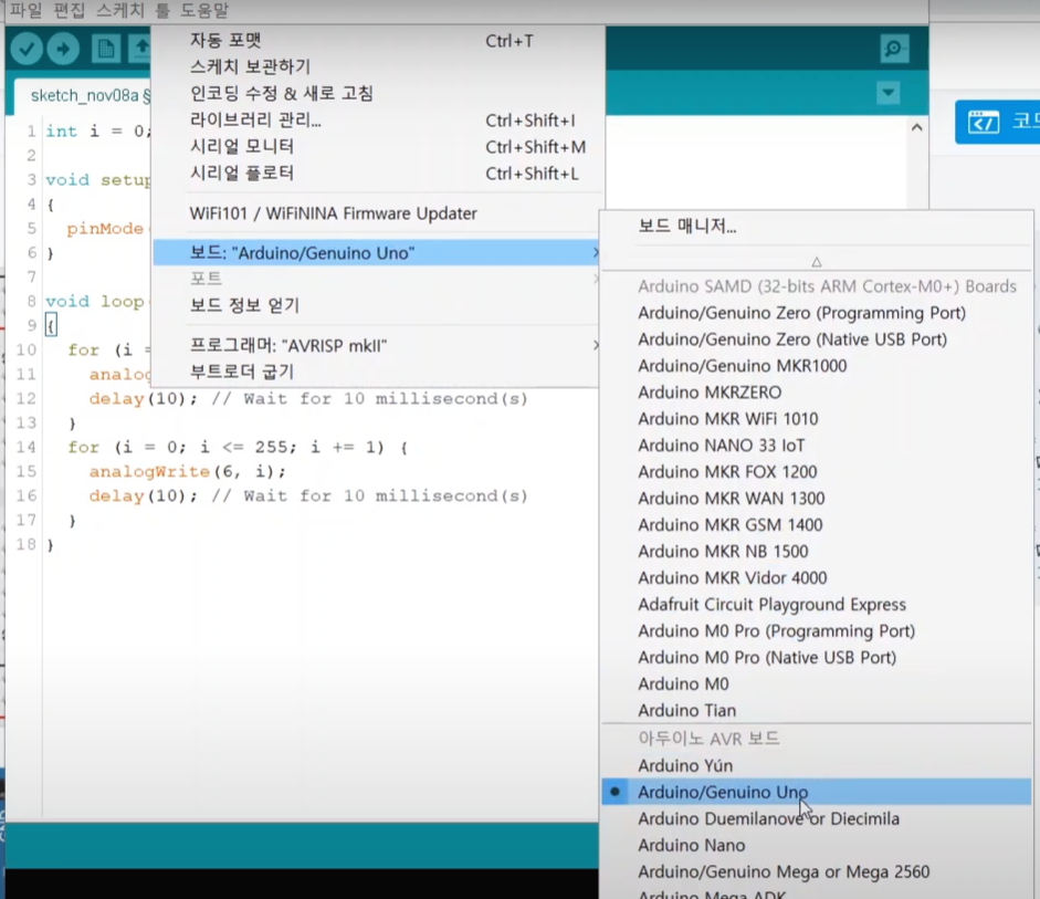 먼저 [툴] 메뉴에서 자신이 가지고 있는 보드의 종류를 선택합니다.