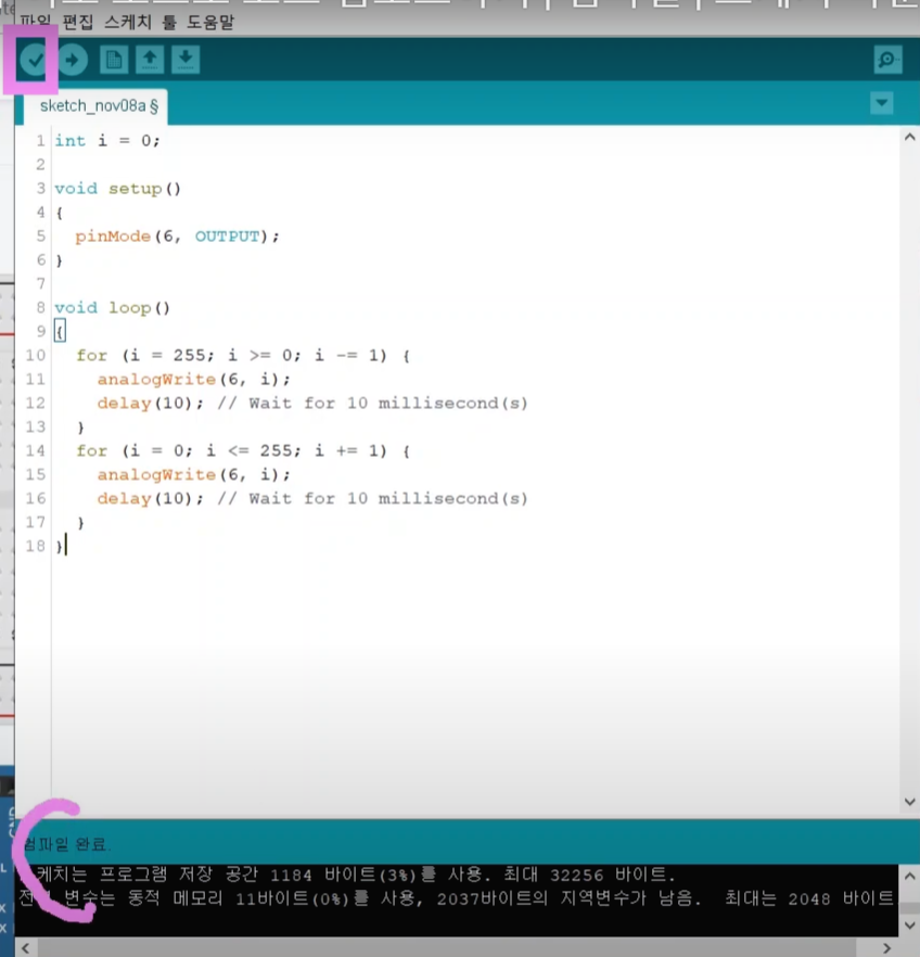 컴파일 바로 옆에 있는 [업로드]버튼을 클릭해 줍니다.