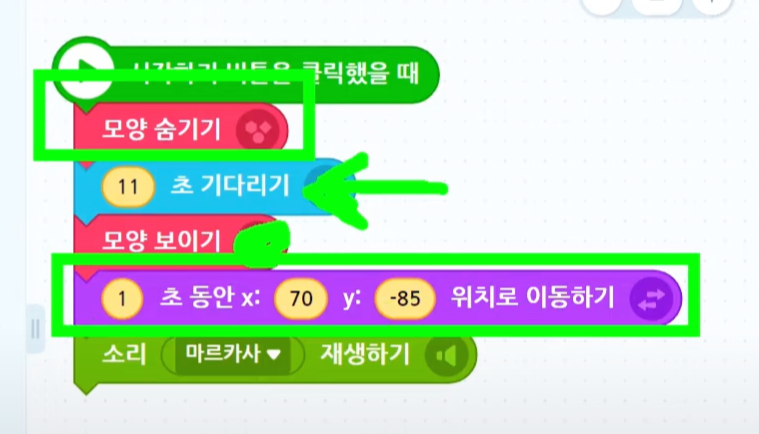 먼저 모양을 숨겨주고~ 각각의 장식들이 등장하게 될 시점까지 ~초 기다리기 블록을 사용해 줄거에요.