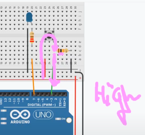 버튼이 눌러지면, 3번핀으로 전류가 흘러들어와서 3번 핀이 HIGH가 되는거에요.