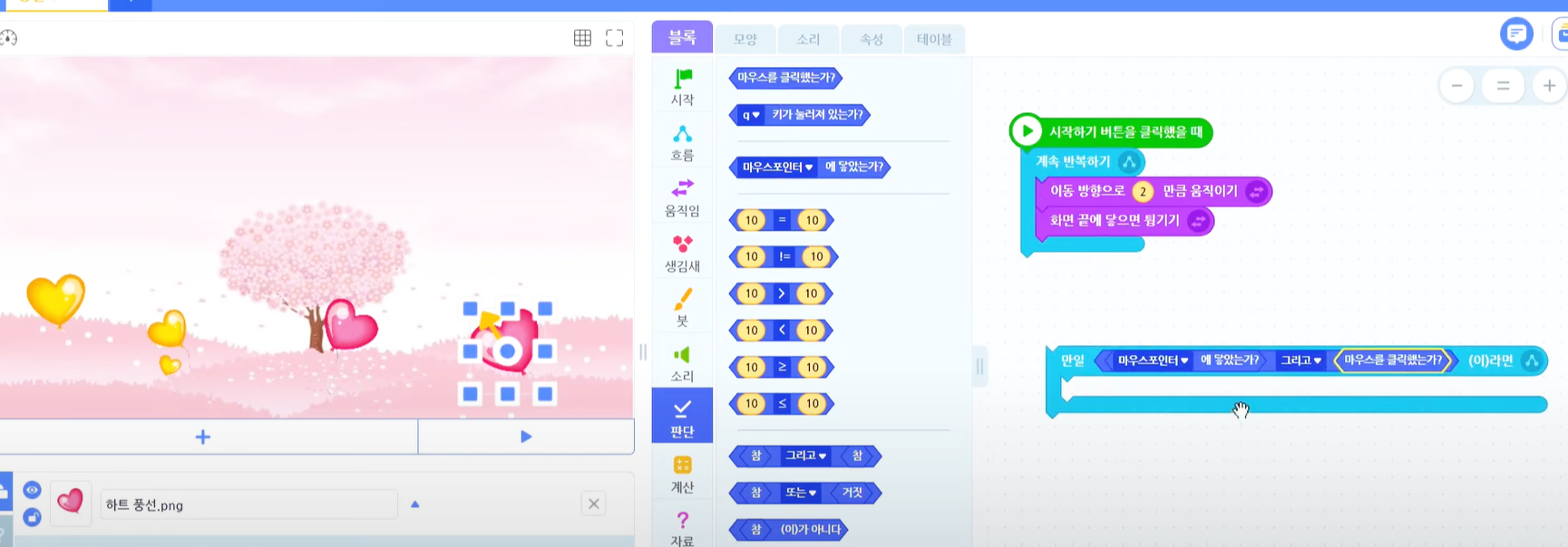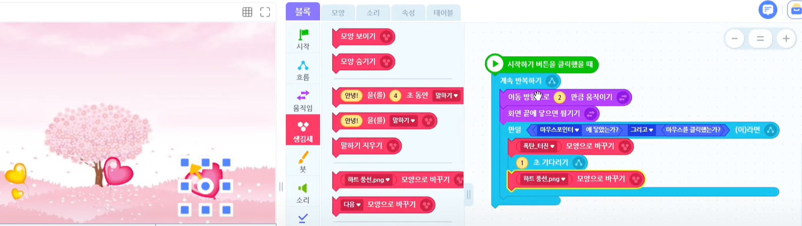 이제 마우스를 클릭해서 풍선을 터트리는 코딩을 추가해 볼게요.