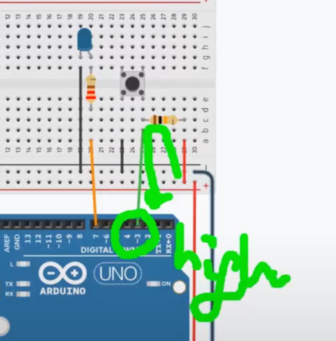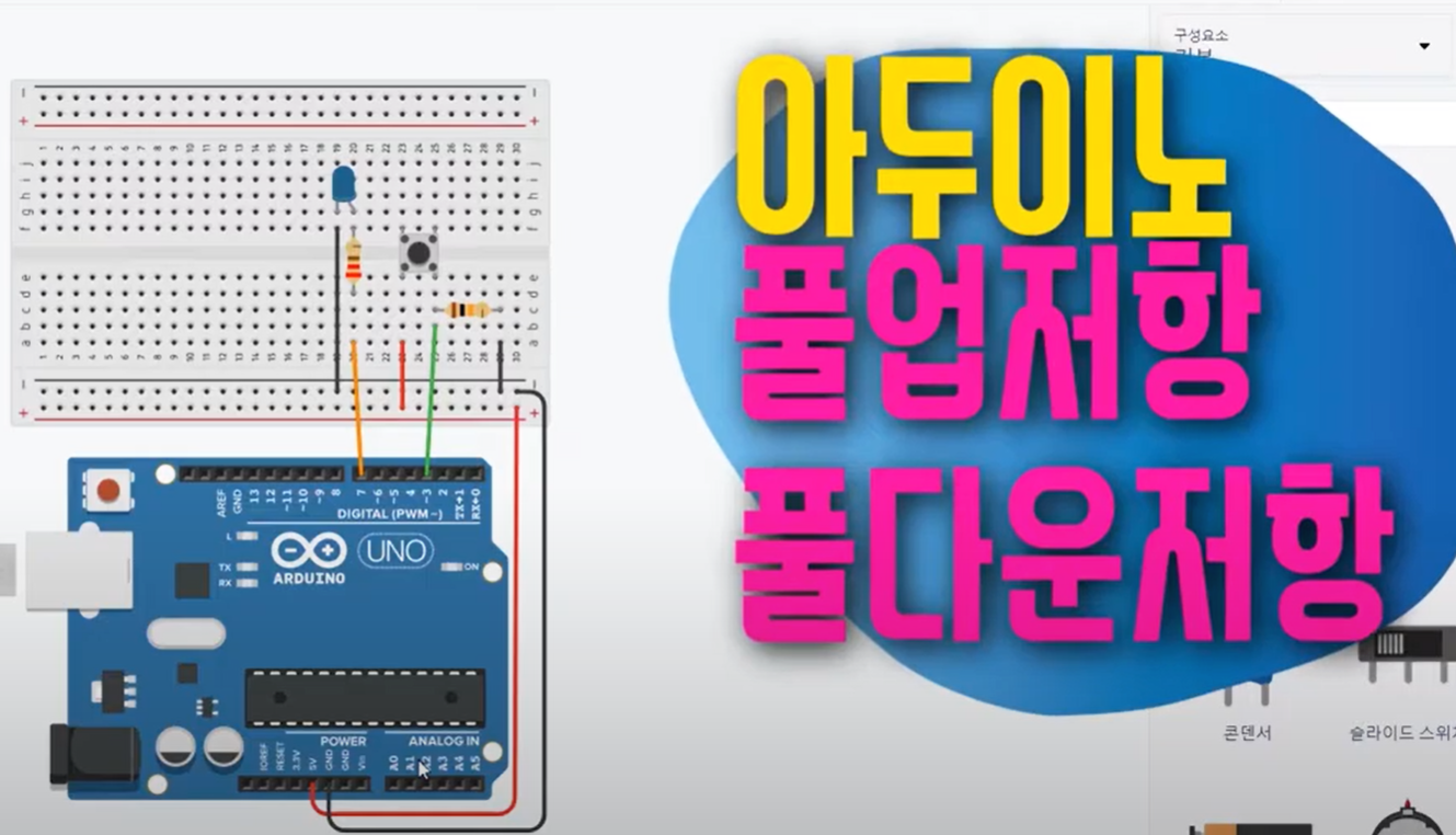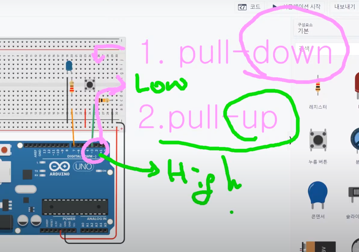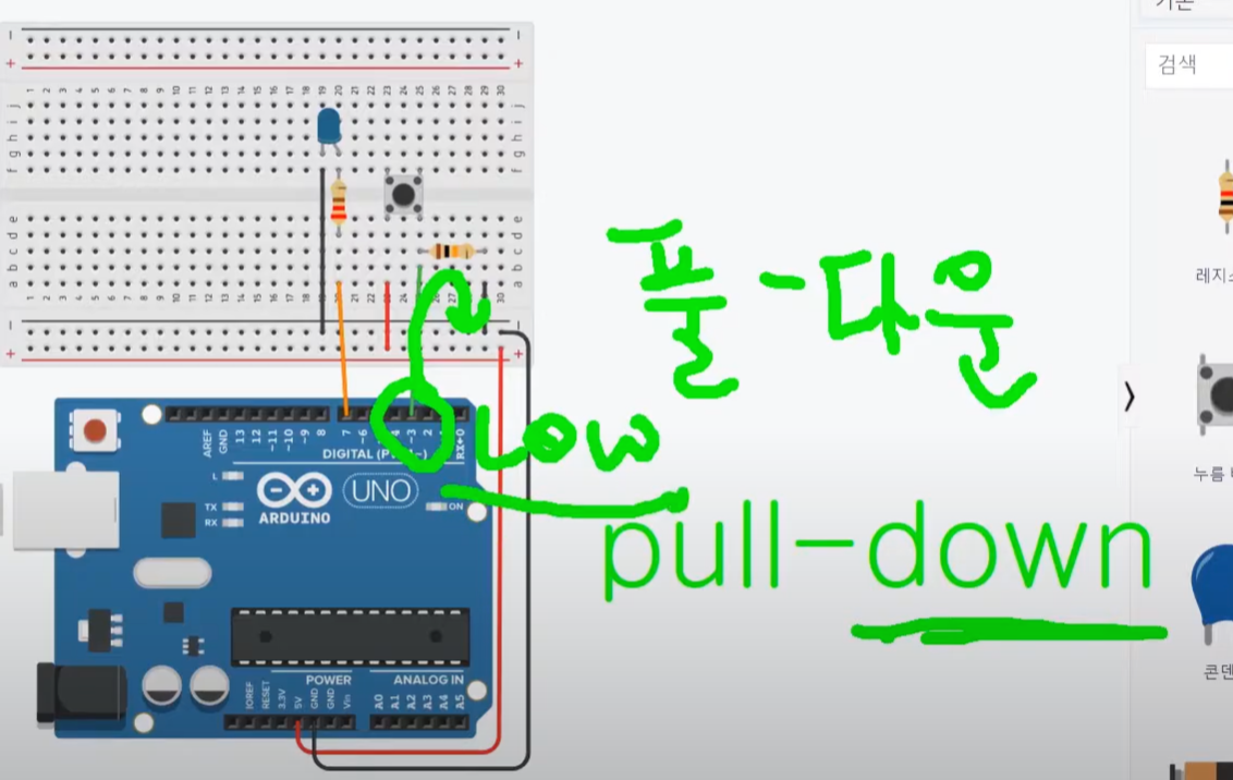지난 포스팅에서 플로팅 현상을 제거하기 위해, 버튼이 연결된 3번 핀쪽 회로를 저항을 사용해서 그라운드로 빼주었는데요. 이러한 회로를 풀다운 저항이라고 합니다.