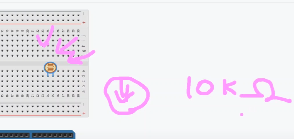 그래서 빛이 너무 많이 들어올 경우, 과전류가 흐를 수 있어요. 그래서 과전류가 흐르는 것을 방지하기 위해, 저희는 저항을 사용해 줄 거랍니다. 조도센서의 저항은 일반적을 10K 옴을 많이 사용한답니다.