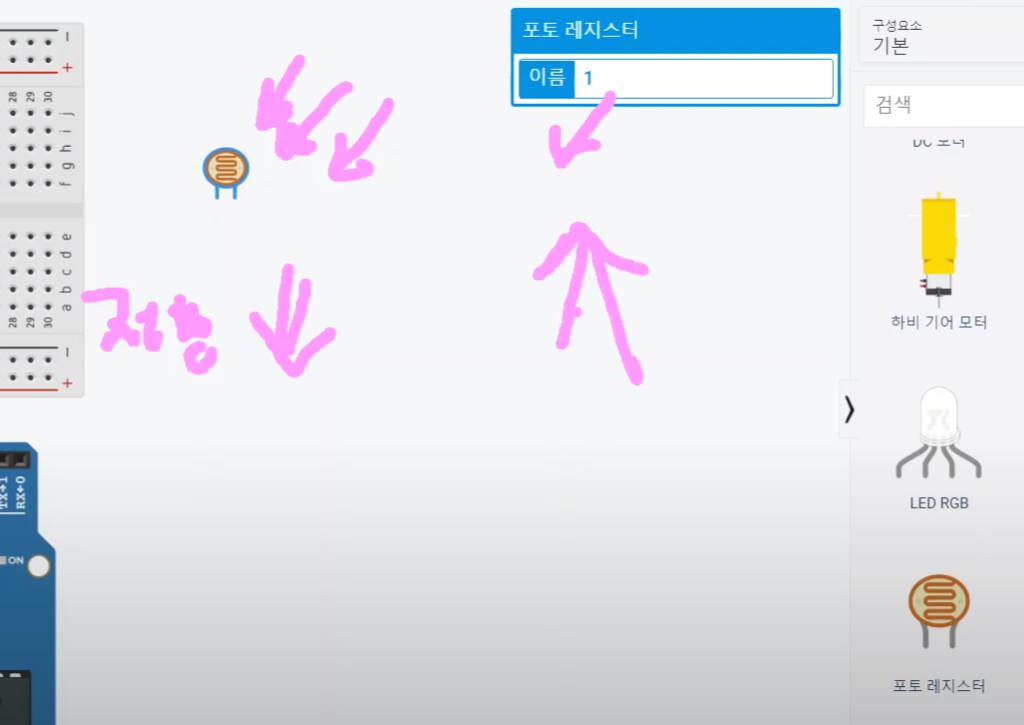조도센서의 회로를 구성해 볼 텐데요.
