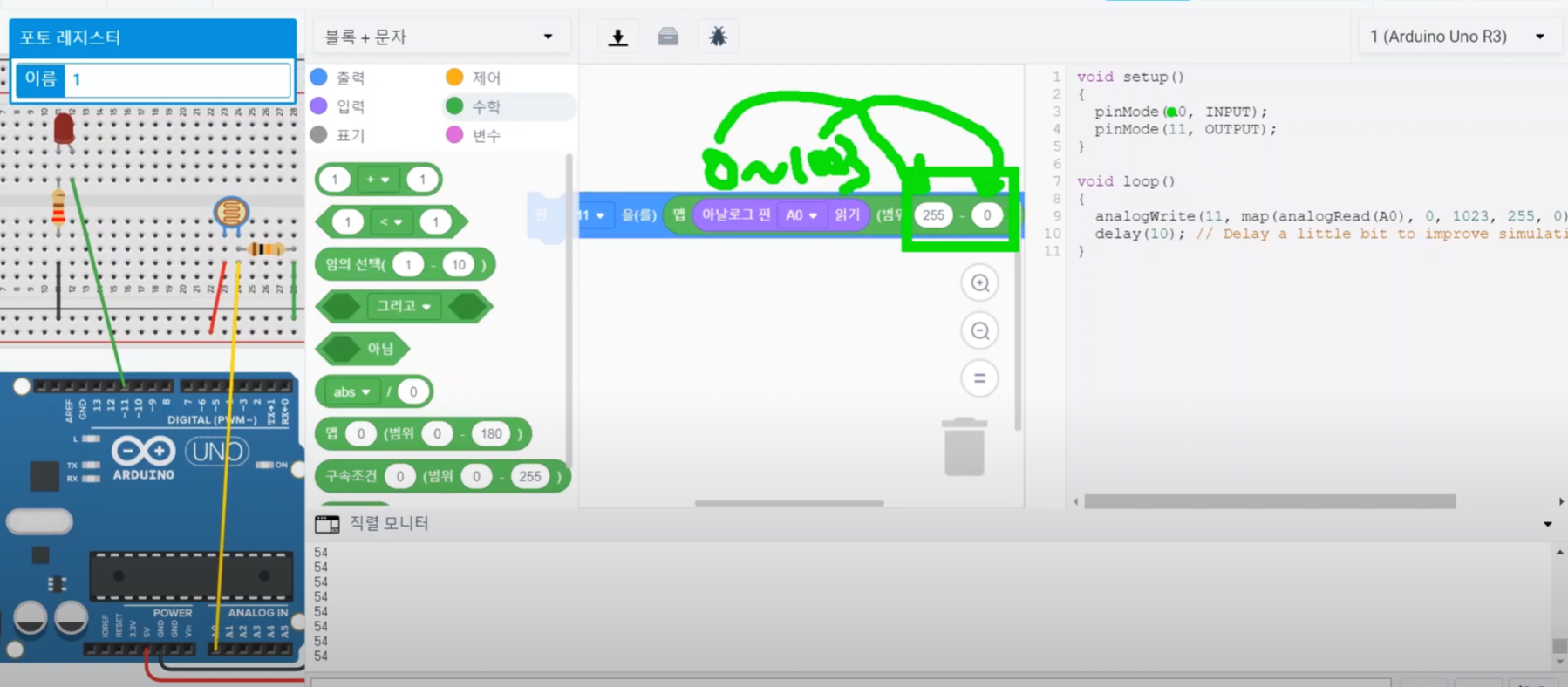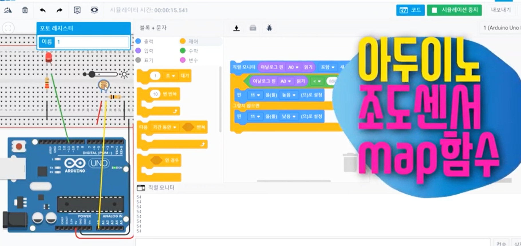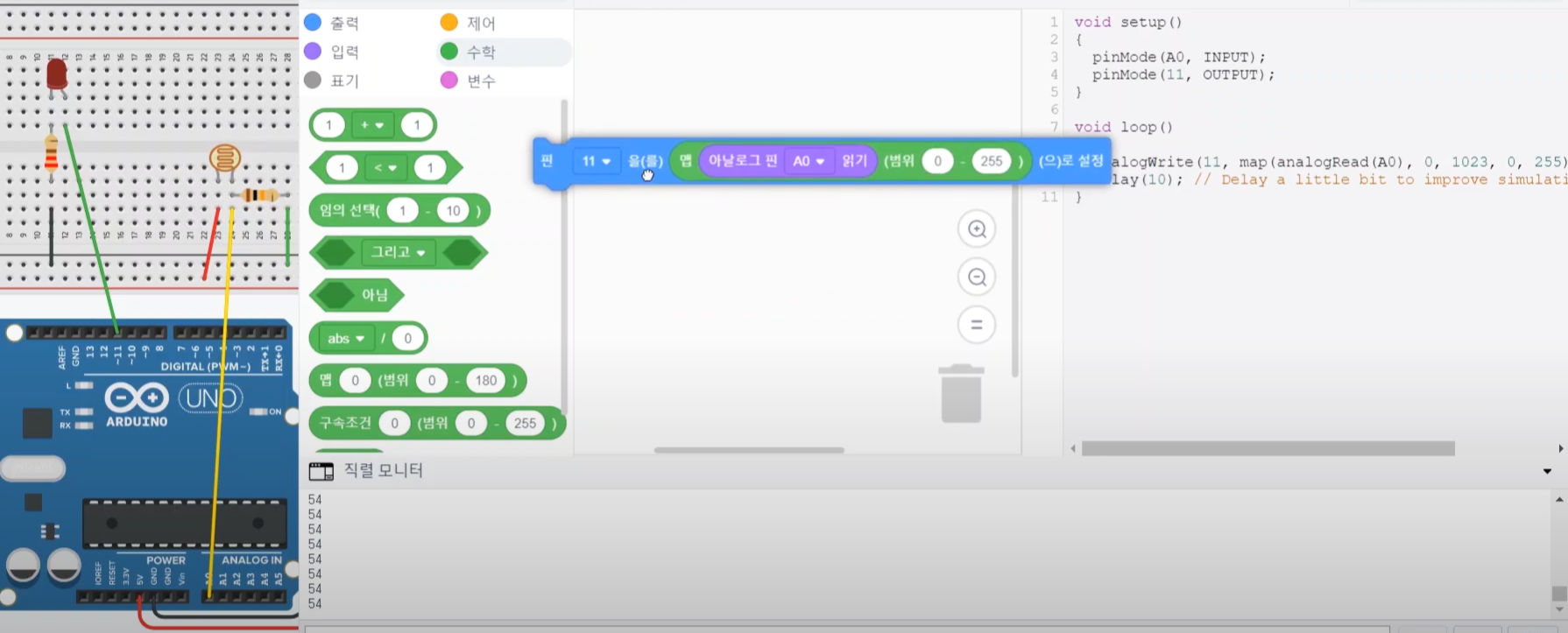 이 map 함수에 조도센서가 연결된 "아날로그 핀 A0 읽기" 블록을 넣어줍니다.