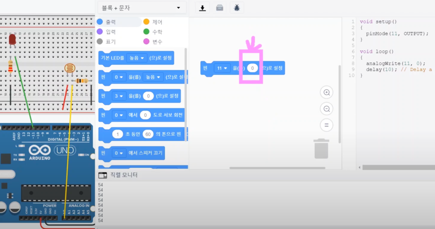 먼저 아래와 같이 LED를 아날로그 출력으로 제어하기 위해, "핀 11번은 ~으로 설정"이라는 핀을 가지고 올게요.