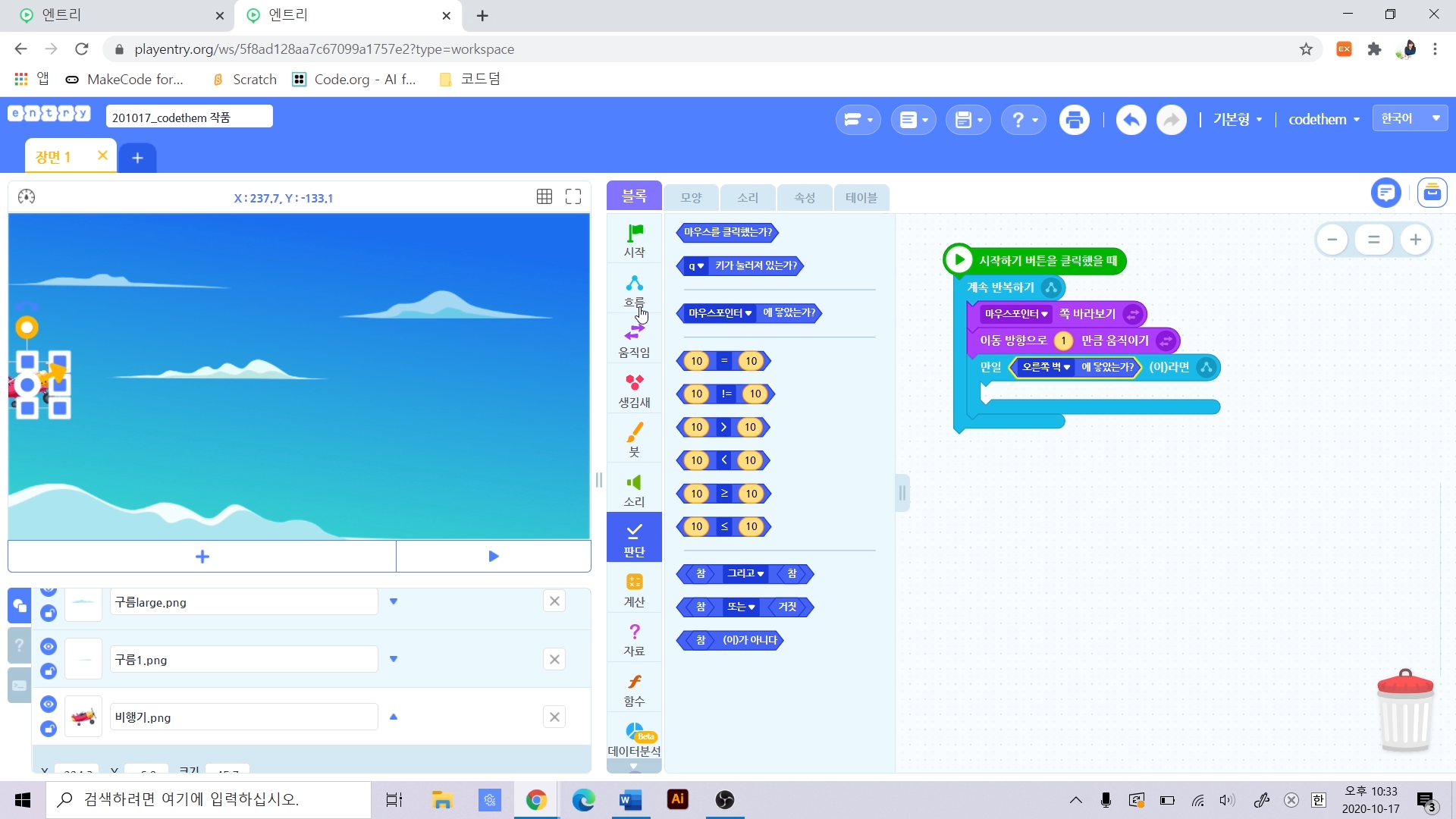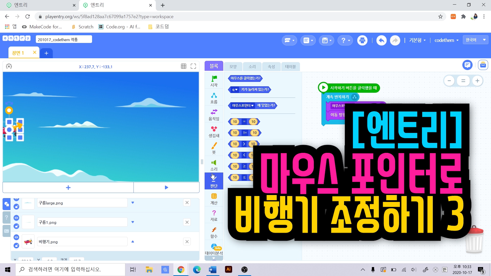 | [엔트리 애니메이션 만들기] 31. 마우스 포인터로 비행기 조정 2편 | 둥둥 떠다니는 구름 코딩하기 (0) | 2020.11.29 |