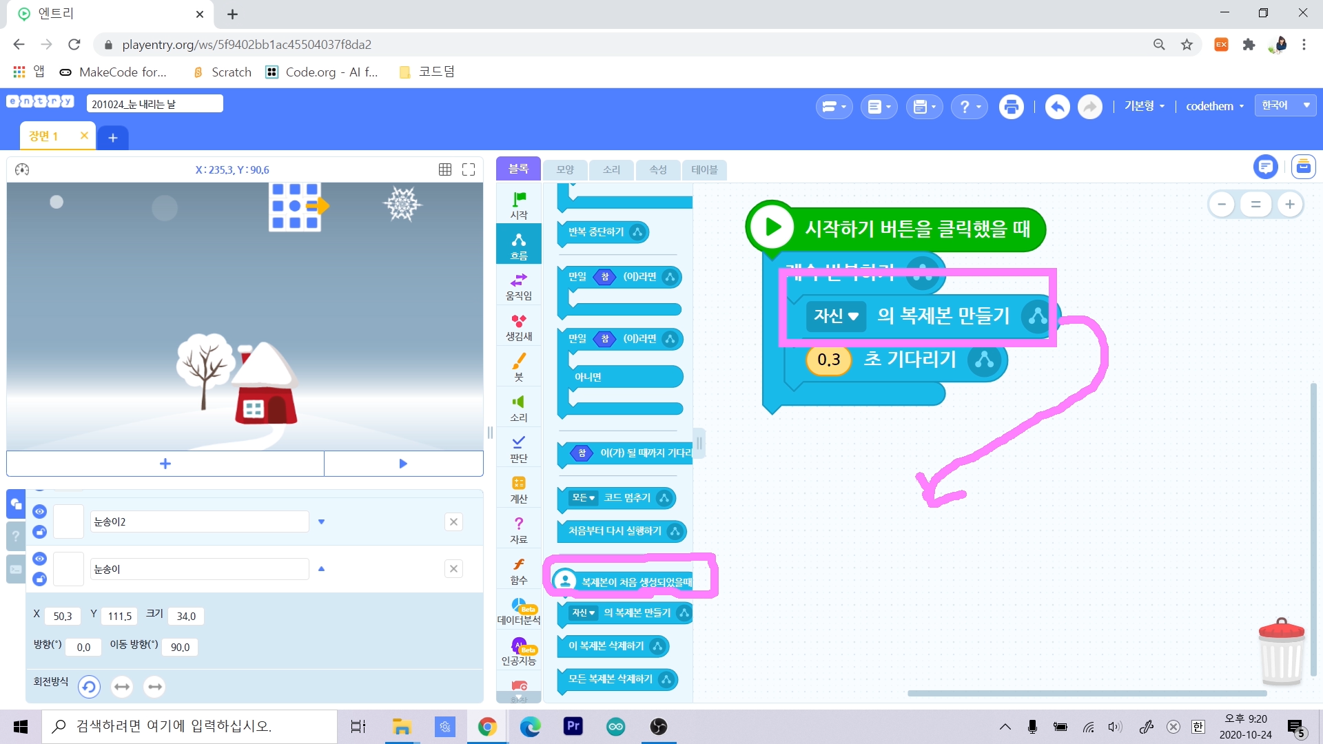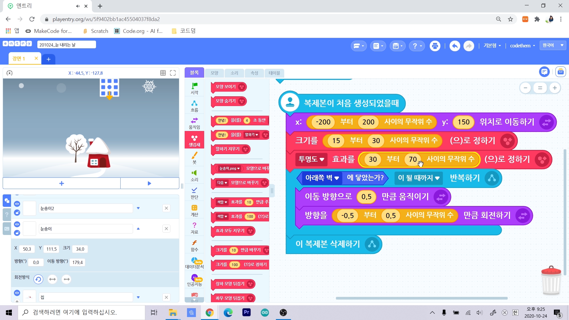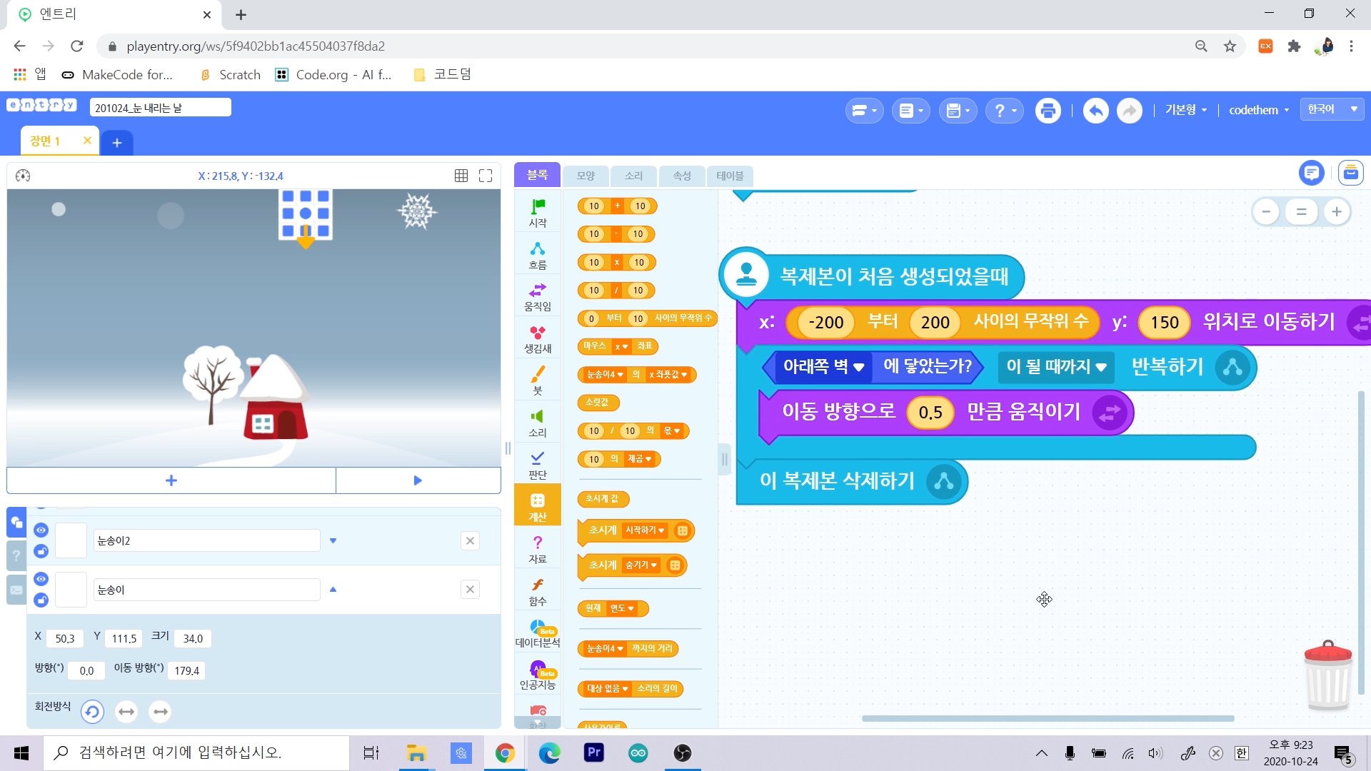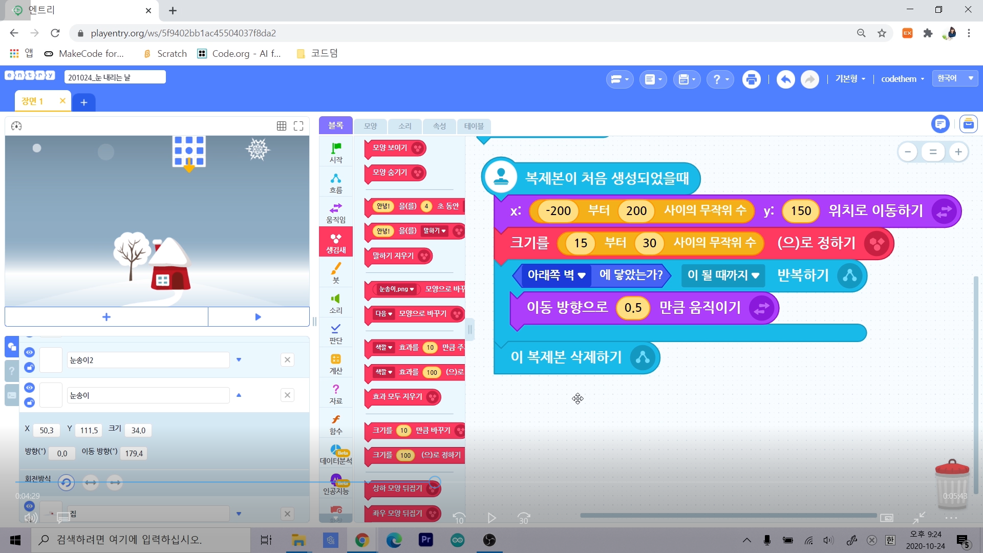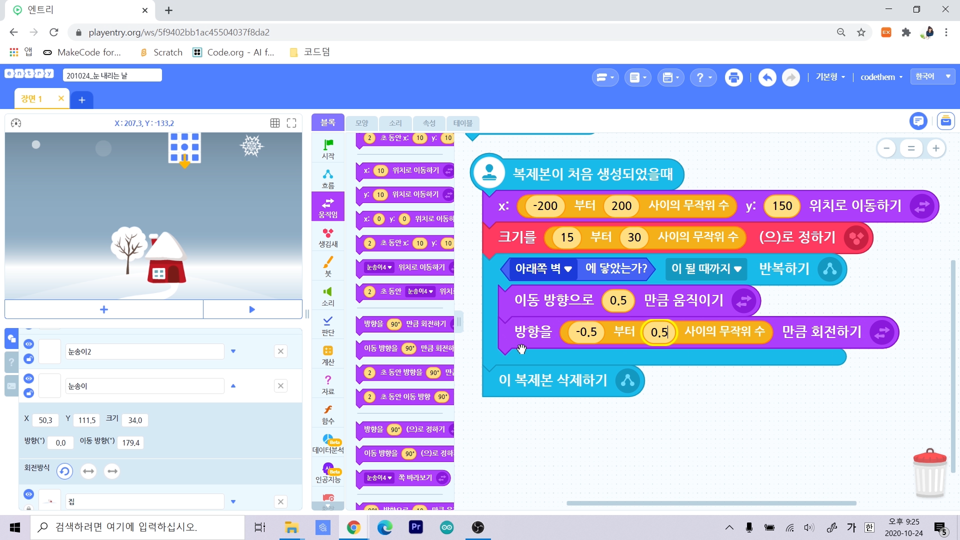 오늘은 하늘에서 눈이 펑펑 쏟아지는 애니메이션을 엔트리로 한번 만들어 볼 거랍니다.