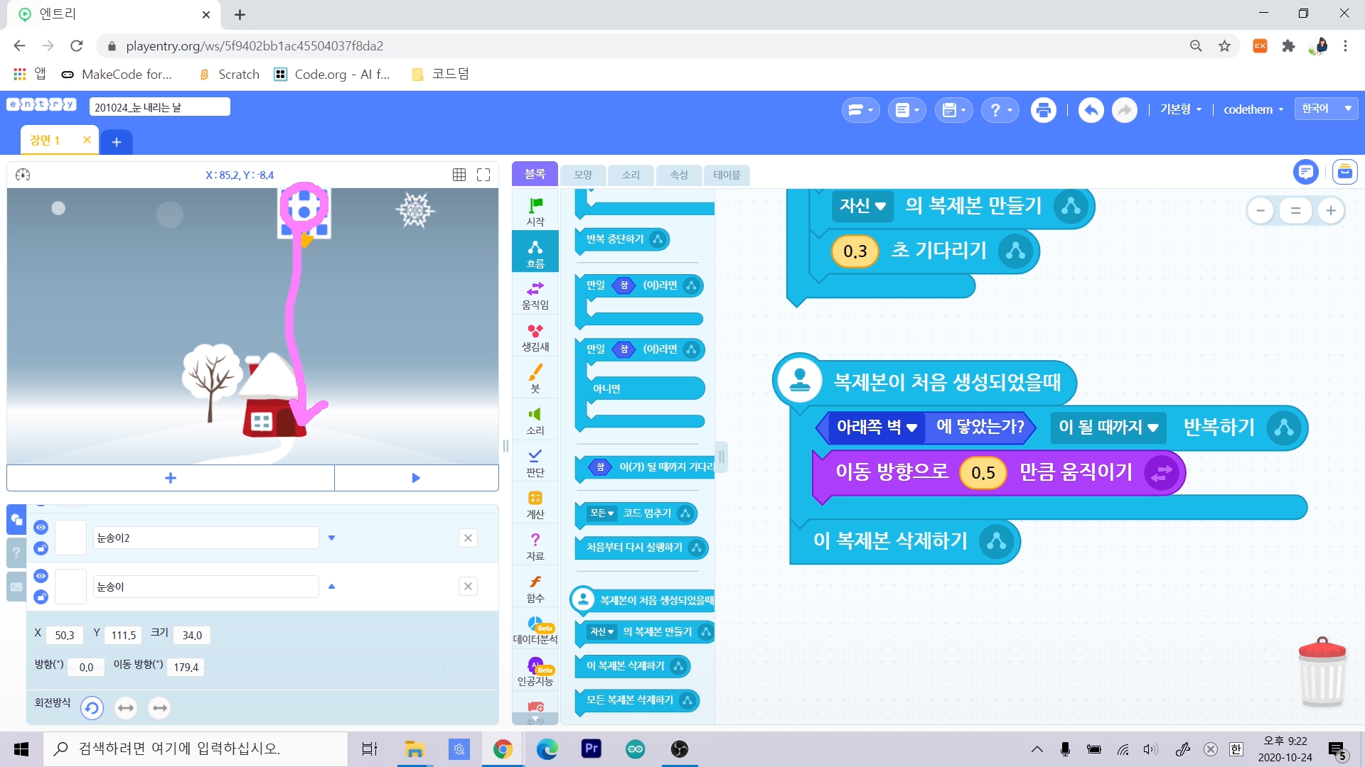 이제 이 복제본이 아래로 떨어지도록 <벽에 닿을 때까지 반복하기> 블록을 사용해서 아래쪽 벽에 닿으면 복제복이 삭제되도록 만들어 줄게요.