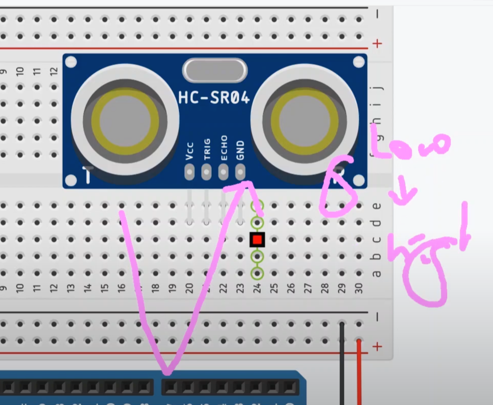 Echo핀은 처음에는 LOW로 있다가, 발사한 초음파가 장애물에 반사되어 되돌아오면,