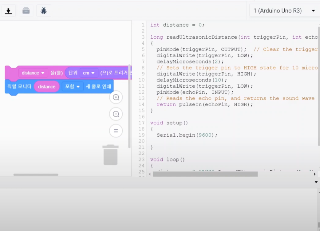 시뮬레이션을 누르면, 아래 직렬 모니터를 통해서 거리 값이 어떻게 변화하는지 확인하실 수 있답니다~