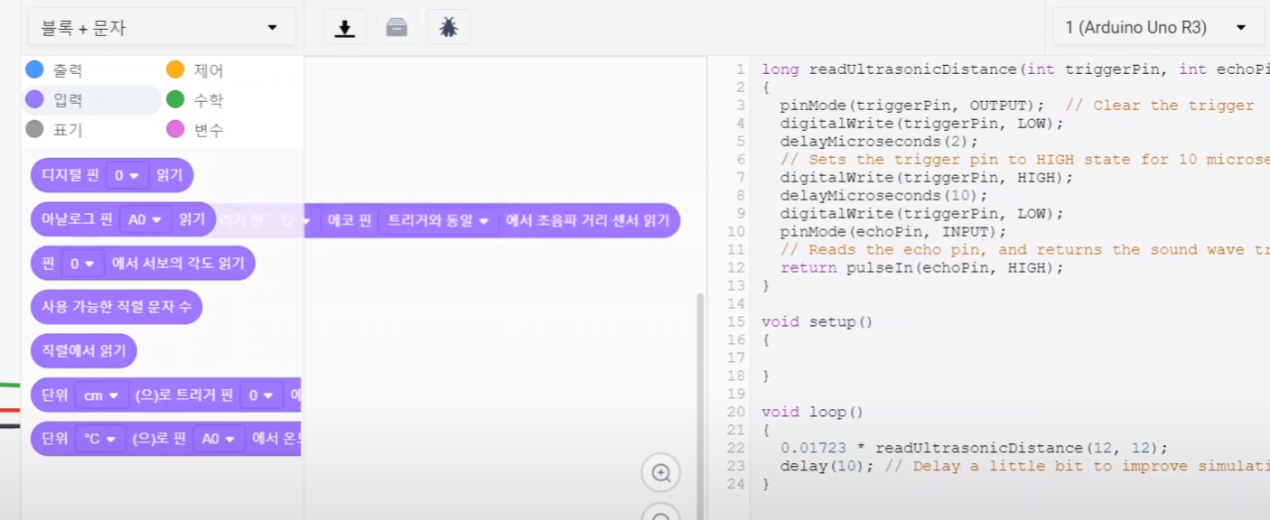 초음파 센서는 블록코딩에서 거리 읽기 블록을 사용할게요.