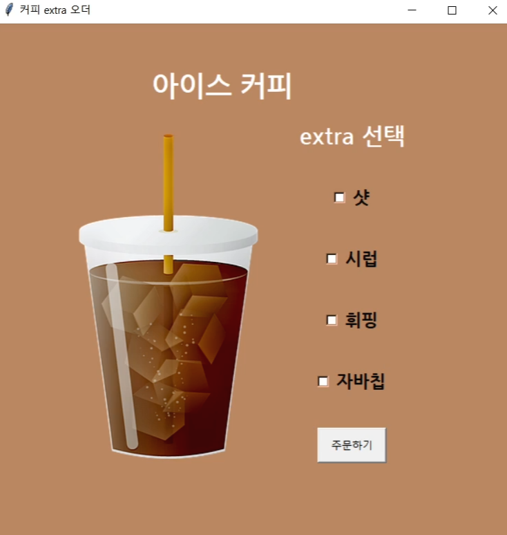 이번 파이썬 강의에서는 커피 주문 시스템 중, extra 주문을 넣는 방법을 tkinter의 체크버튼을 사용해서 만들어 볼 거랍니다.